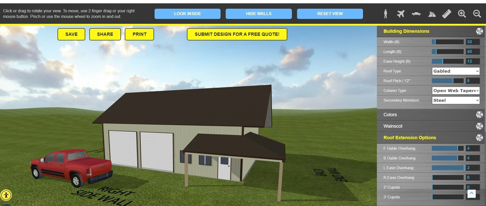 With options to save, print, share, or submit your design for a free quote, it provides a complete end‑to‑end experience for planning your steel building.